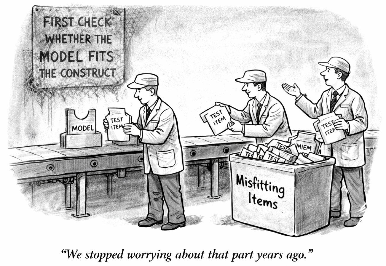 In fact—in actual practice—we select a (usually unidimensional) model and then exclude items that do not fit that model, regardless of whether they are good fits for the construct. Items do not get past post-field testing data review, or even if they do they never make it onto actual test forms. And this teaches content development professionals (CDPs) not to write the kinds of items that won’t ever be used—that don’t fit the model. Too many people mistakenly confuse an item not fitting a model for not fitting a construct.
